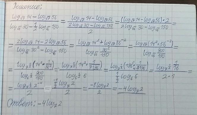 log 14 (по основанию √7) - log 56 (по основанию √7) / (log 30 (по основанию √6) - 1/2 log 150 (по основанию √6))