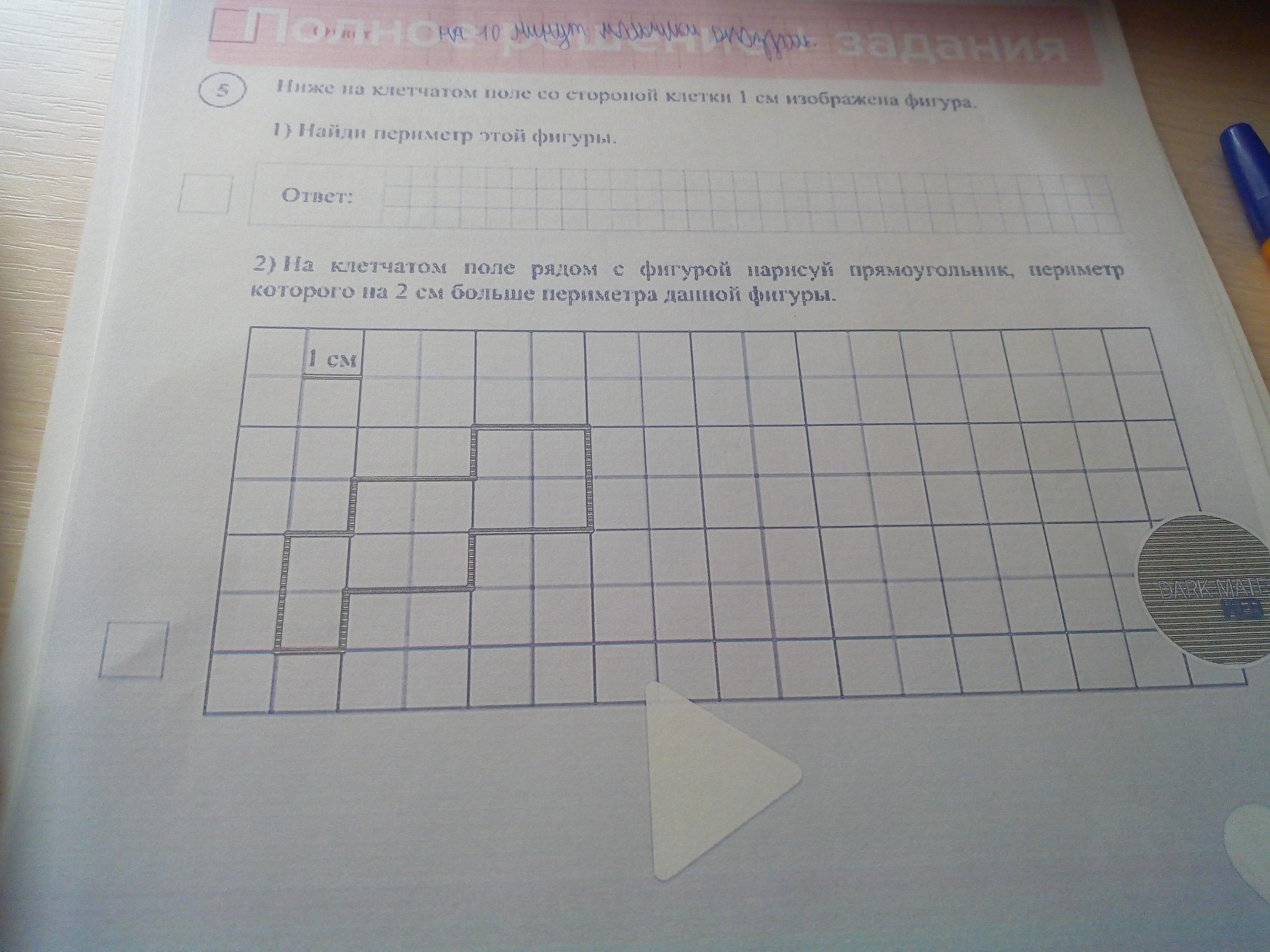 2) На клечатном поле рядом с фигурой нарисуй прямоугольник, периметр которого на 2 см больше периметра данной фигуры