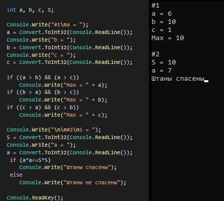 Вводимо 2 числа A та S. Якщо площа плями a*a<==s, то штани врятовано, інакше : штани не врятовано.