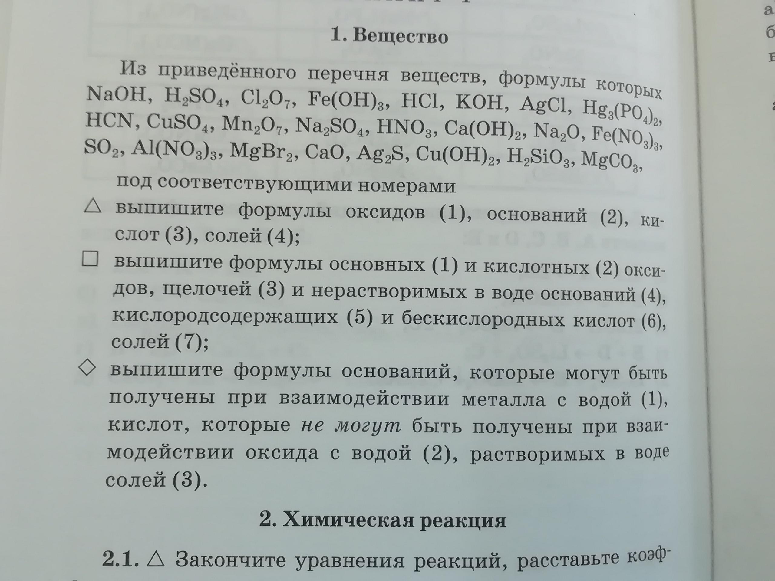 (2) - основания: NaOH, Fe(OH)2, KOH, Ca(OH)2, Cu(OH)2,