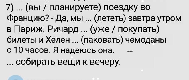 7) … (you / to plan) your trip to France yet? – Yes, we … (to fly) to Paris tomorrow morning. Richard … (already / to buy) tickets and Helen … (to pack) suitcases since 10 o’clock. I hope she … (finish) packing up things by the evening.