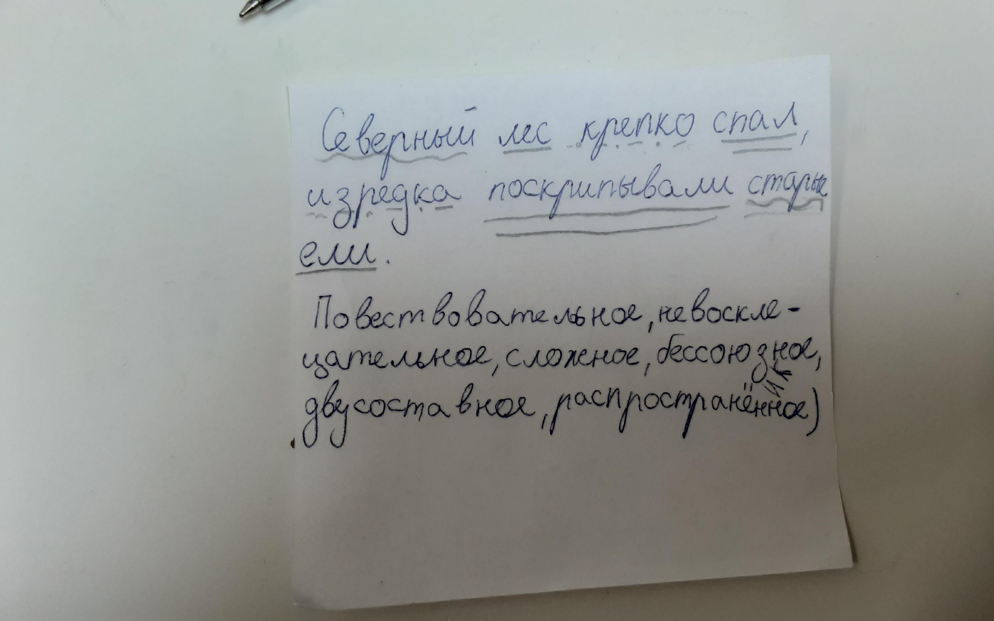 Северный (определение) лес (подлежащее) крепко (обстоятельство) спал (сказуемое), изредка (обстоятельство) поскрипывали (сказуемое) старые (определение) сосны (подлежащее).
