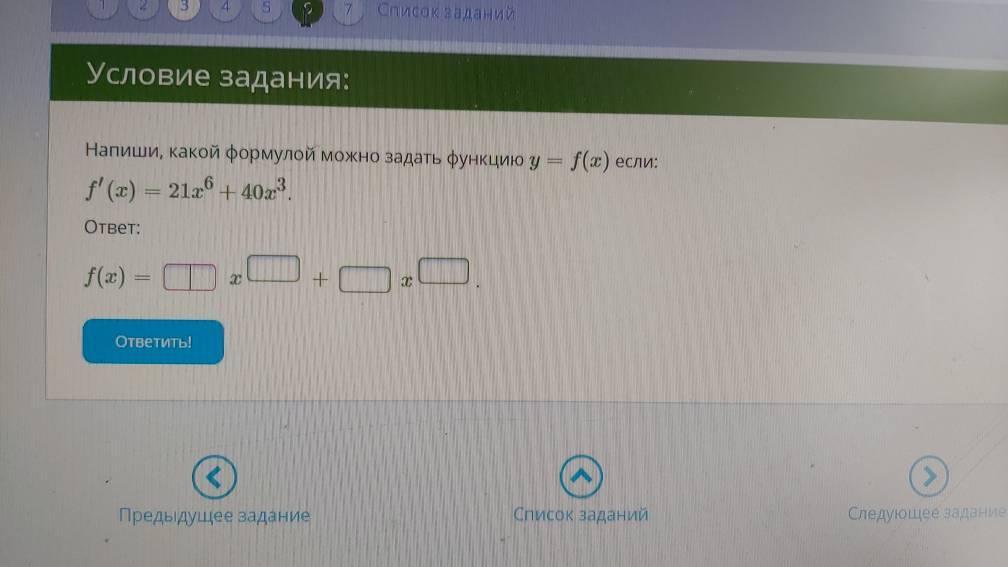F(x)=21x^(6+1)/(6+1)+40x^(3+1)/(3+1)=21x^7/7+40x^4/4=3x^7+10x^4