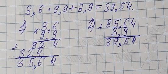 Ответ: сначала умножаем: 35,64+3,9=39,54.