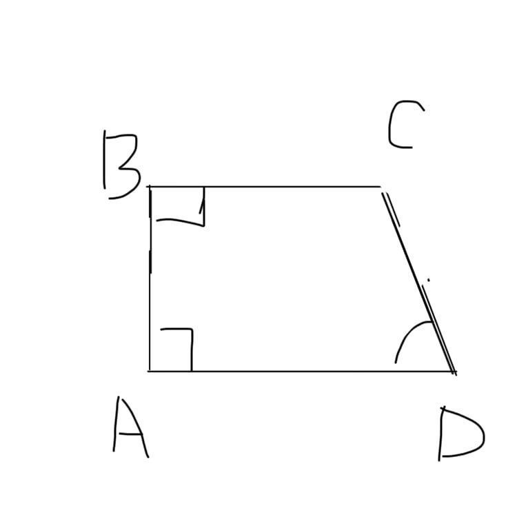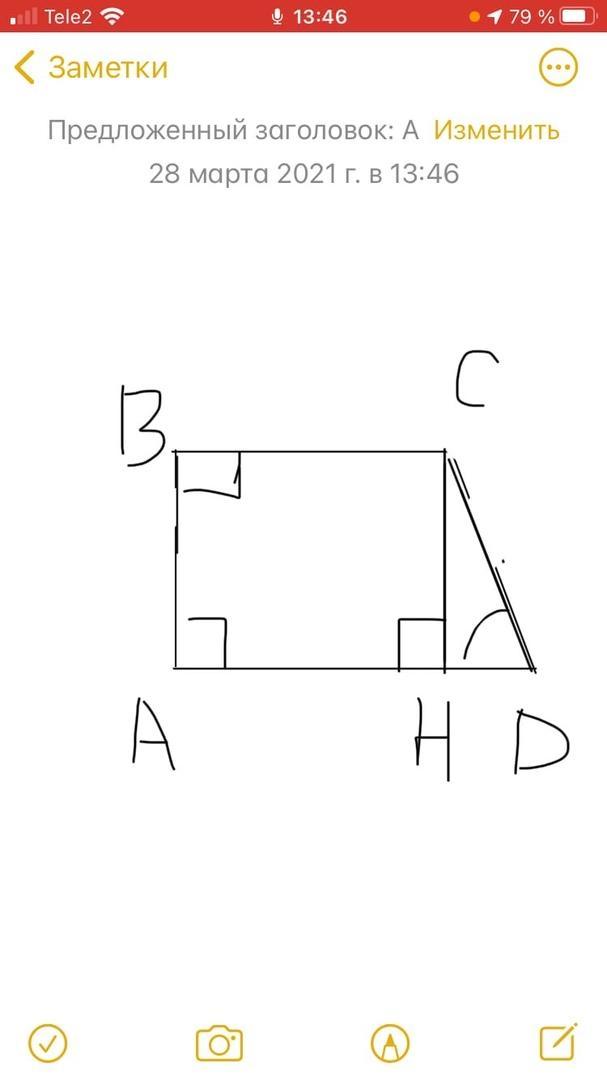 2) Проведем высоту из вершины С. Тогда трапеция поделится на прямоугольник ABCH(т.к все углы =90 градусов) и треугольник CHD. Рассмотрим треугольник CHD. В нем: