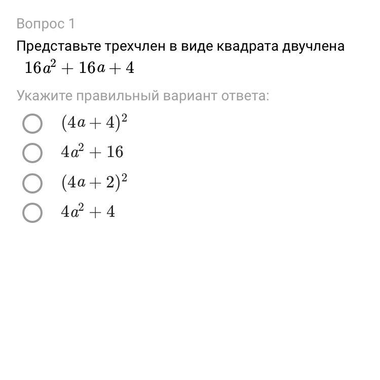 16a² + 16a + 4 = (4a)² + 2 * 4a * 2 + 2² = (4a + 2)²