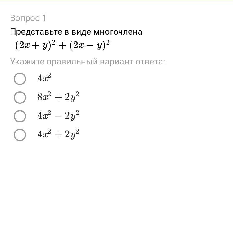 (2x+y)² + (2x-y)² = 4x²+4xy+y² + 4x²-4xy+y² = 8x²+2y².