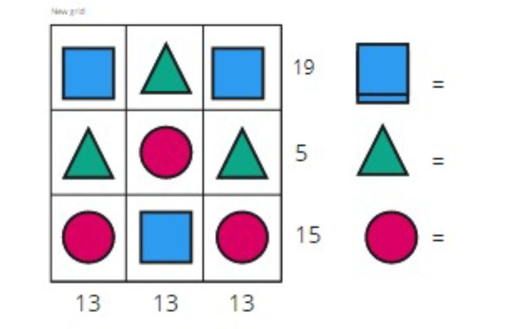 9+9+?=19 => Зеленый = 1 подставим под вторую строку. 1+1+?=5. Красный = 3.