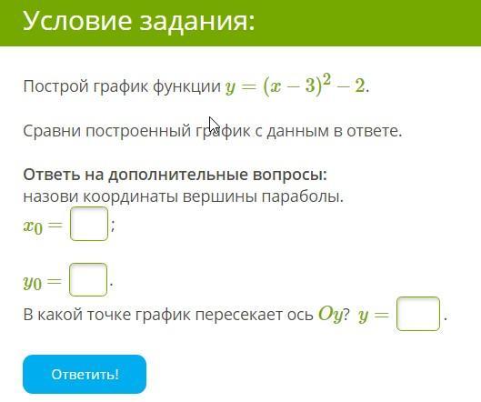 то точка (a;b) является вершиной параболы. В данном случае a=3, b= –2, потому вершина находится в точке (3;–2)
