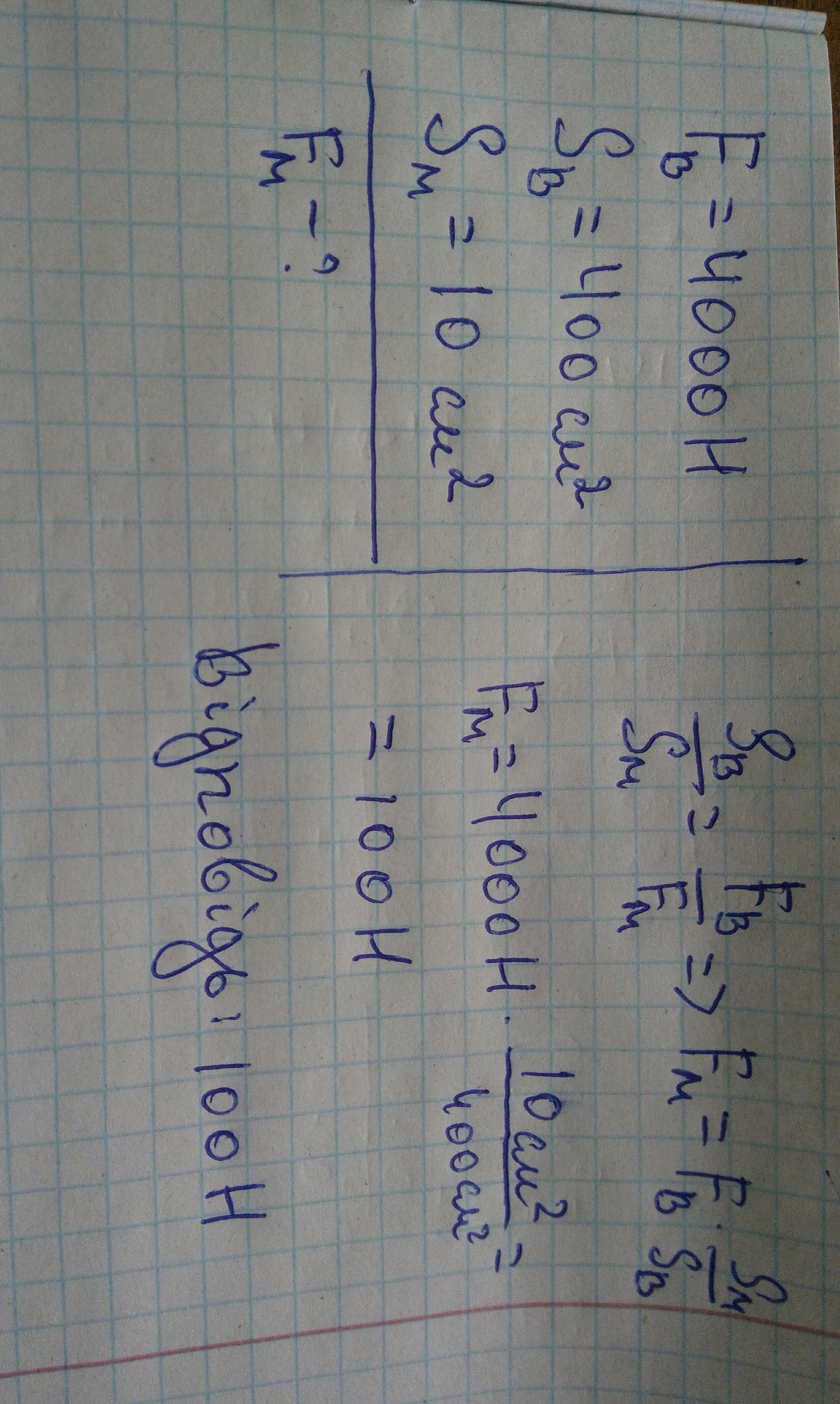 на більший поршень гідравлічної машини діє сила 4000 н яка сила діє на меньший поршень якщо площі поршнів дорівнюють 400см² і 10см2?