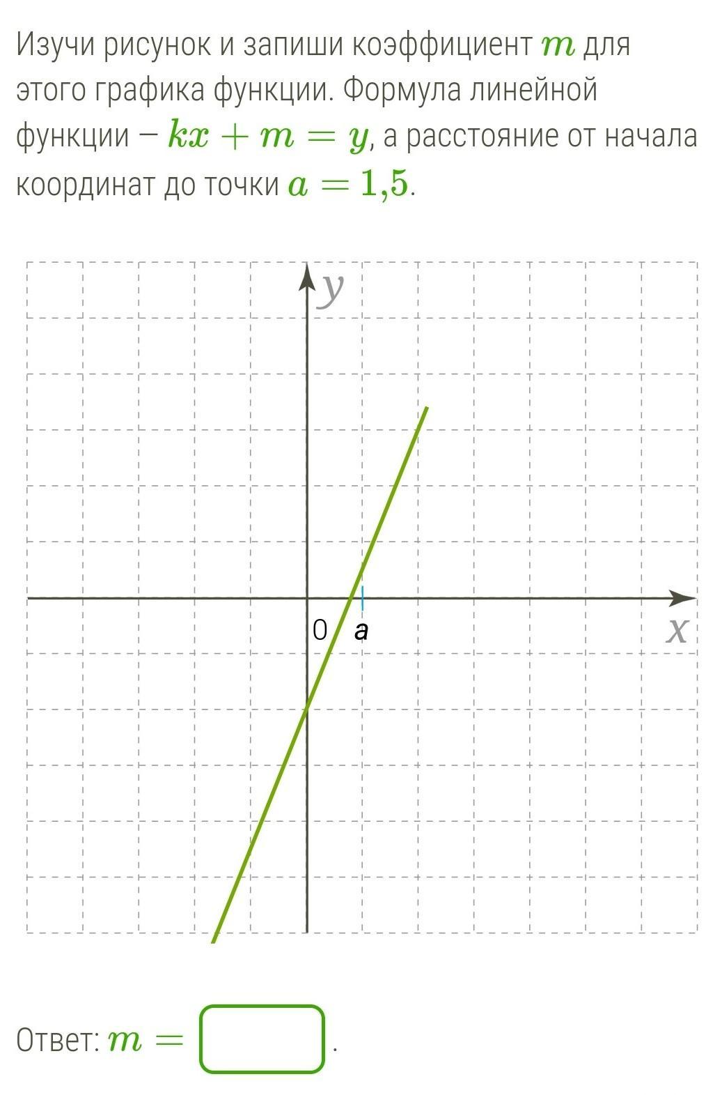 Изучи рисунок и запиши коэффициент m для этого графика функции. Формула линейной функции — kx+m=y, а расстояние от начала координат до точки a= 1,5. СРОЧНО!!
