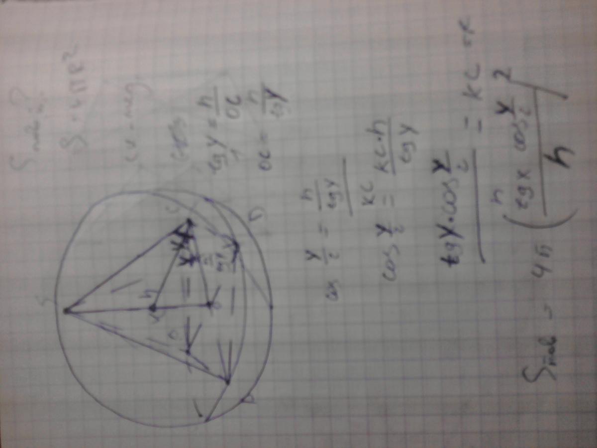 знайдіть площу поверхні кулі описаної навколо правильної чотирикутної піраміди, якщо її висота дорівнює h, а бічне ребро утворює з площиною основи кут y