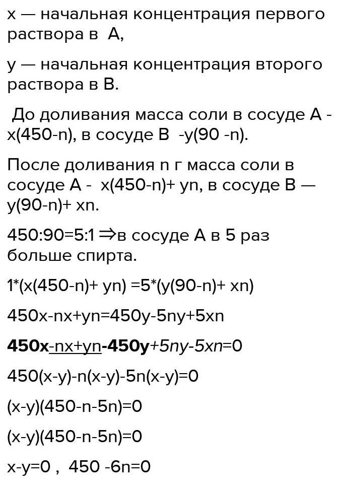 Из двух сосудов А и Б, в которых находятся растворы с различным процентным содержание одной и той же соли, отлили соответственно в пустые пробирки С и D по n граммов растворов. Затем раствор из пробирки C вылили в сосуд В, а раствор из пробирки D — в сосуд А. После этого процентное содержание соли в полученных растворах в сосудах А и В стало одинаковым. Найдите n, если в сосуде А было 450г раствора, в сосуде В — 90г.