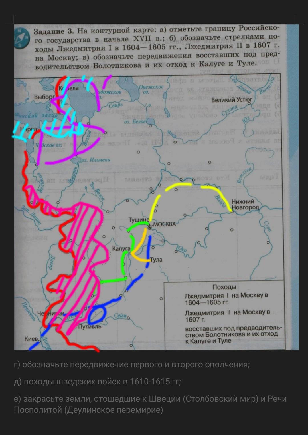 е) Голубой цвет - Столбовский мир, розовый цвет - Деулинское перемирие.