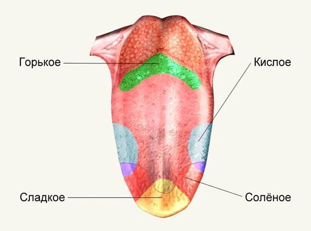 Задняя часть языка - чувствительная к горькому, кончик - к сладкому, боковые поверхности впереди - к соленому, а ближе к задней части - к кислому.