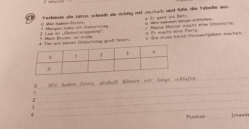 Verbinde die Sätze, schreib sie richtig mit deshalb und fülle die Tabelle aus.