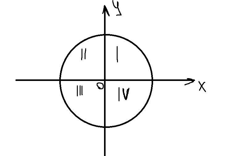 2 четверть: x < 0; y > 0 => sin > 0; cos < 0; tg < 0; ctg < 0;