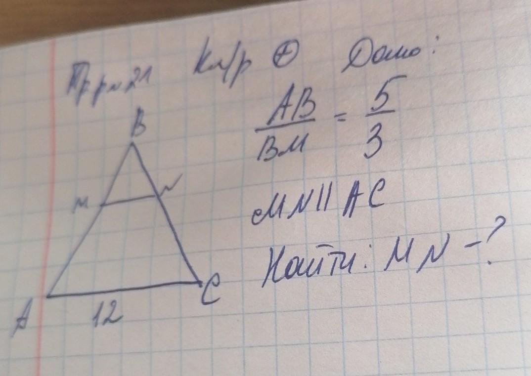 треугольник ABC подобен треугольнику MBN по двум углам (угол ABC - общий, угол ACN = углу MNB (соответственные при параллельных прямых)), => AC/MN = AB/BM = 5/3 => MN = 12*3/5 = 7.5