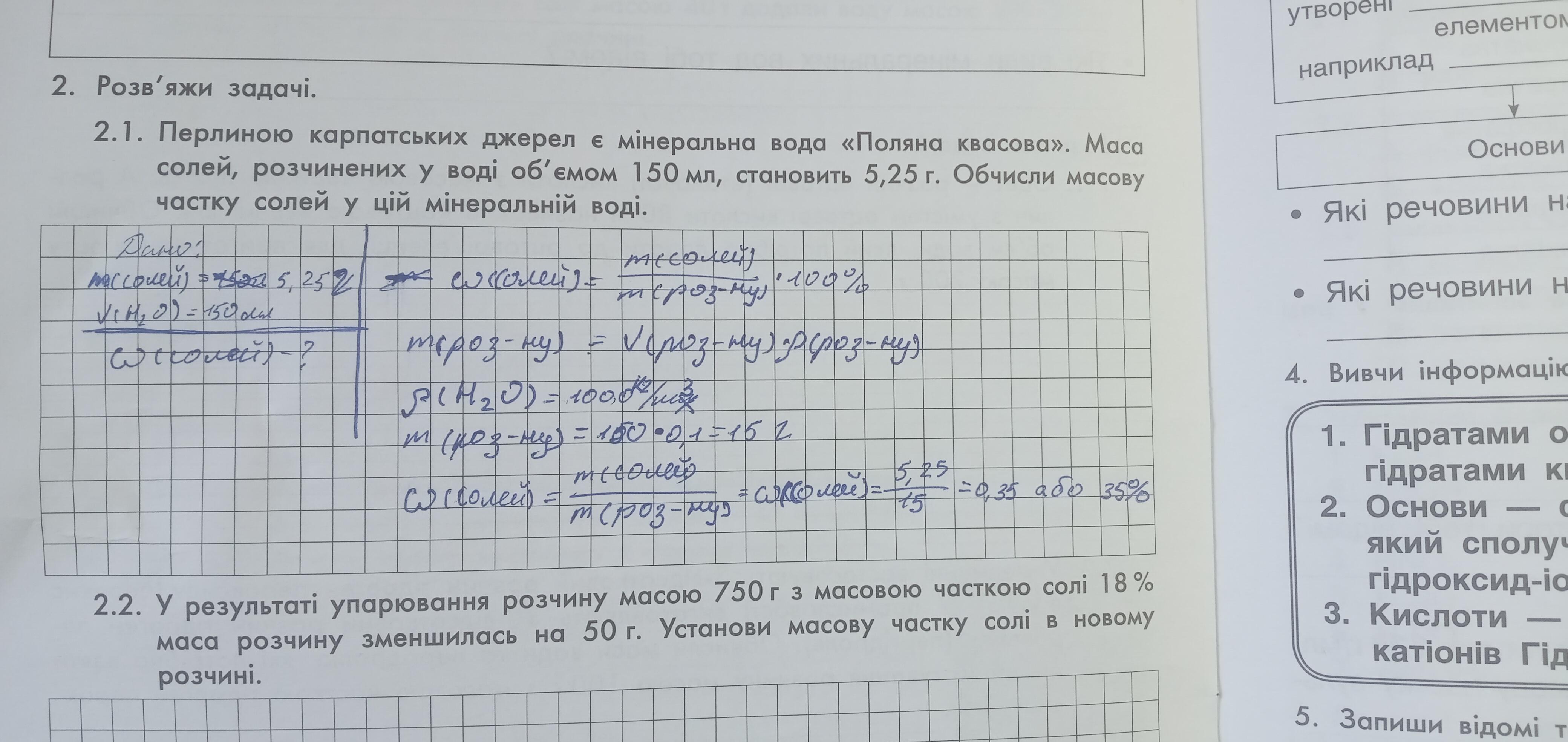 солей, розчинених у воді об'ємом 150 мл, становить 5,25 г. Обчисли масову