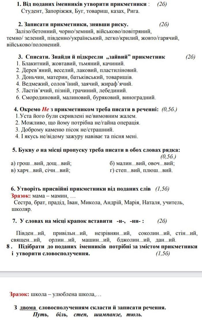 6. Сестра-сестрин, брат-братевий, прадід-прадідовий, Іван-івановий, Микола-миколовий, Андрій-андрійовий, Марія-марієвий, Наталя-наталієвий, учитель-учительська, школяр-школяревий.