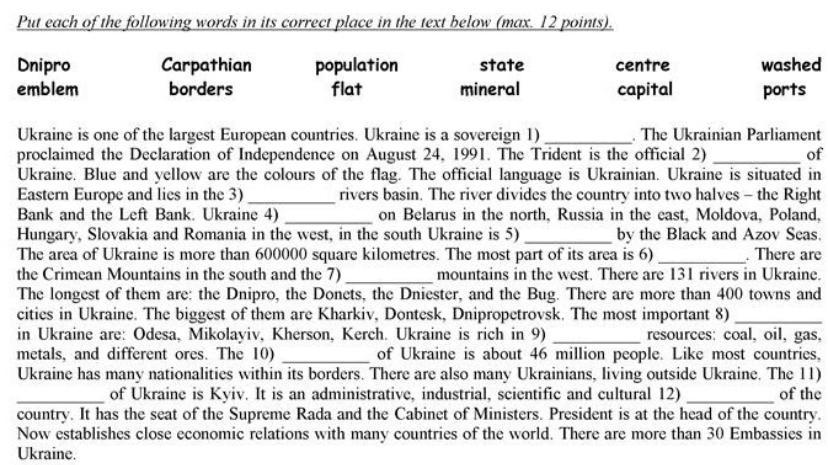 Ukraine is one of the largest countries. Ukraine is a sovereign 1) state. The Ukranian Parliament proclaimed the Declaration of Independence on August 24, 1991. The Trident is the official 2) emblem of Ukraine. Blue and yellow are the colours of the flag. The official language is Ukrainian. Ukraine is situated in Eastern Europe and lics in the 3) Dnipro rivers basin. The river divides the country into two halves — the Right Bank and the Left Bank. Ukraine 4) borders on Belarus in the north, Russia in the cast, Moldova, Poland, Hungary, Slovakia and Romania in the west, in the south Ukraine is 5) washed by the Black and Azov Seas. The area of Ukraine is more than 600000 square kilometres. The most part of its area is 6) flat. There are the Crimean Mountains in the south and the 7) Carpathian mountains in the west. There are 131 rivers in Ukraine. The longest of them are: the Dnipro, the Donets, the Dniester, and the Bug. There are more than 400 towns and cities in Ukraine. The biggest of them are Kharkiv, Donetsk, Dnipropetrovsk. The most important 8) ports in Ukraine are: Odessa, Mikolayiv, Kherson, Kerch. Ukraine is rich in 9) mineral resources: coal, oil, gas, metals, and different ores. The 10) population of Ukraine is about 46 million people. Like most countries, Ukraine has many nationalities within its borders. There are also many Ukrainians, living outside Ukraine. The 11) capital of Ukraine is Kyiv. It is an administrative, industrial, scientific and cultural 12) centre of the country. It has the seat of the Supreme Rada and the Cabinet of Ministers. President is at the jead of country. Now establishes close economic relations with many countries of the world. There are more than 30 Embassies in Ukraine.