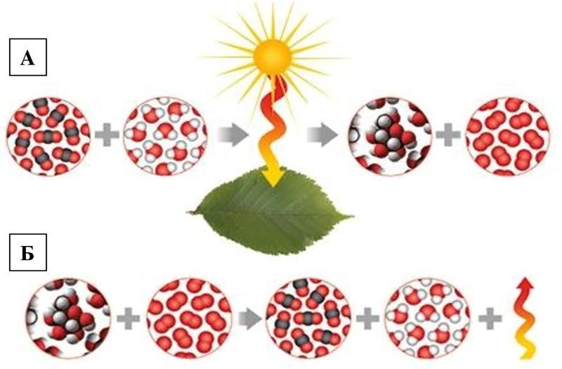 Рассмотрите, обозначенные буквами А) и Б) химические реакции, происходящие в клетках организмов, и ответьте на вопрос. Почему реакция – А) происходит только в клетках растений?