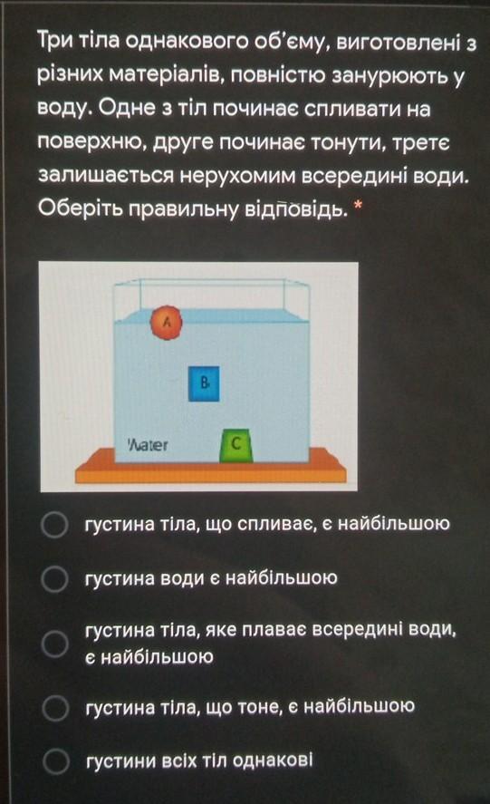 Правильный ответ: г (густина тіла, що тоне, є найбільшою)