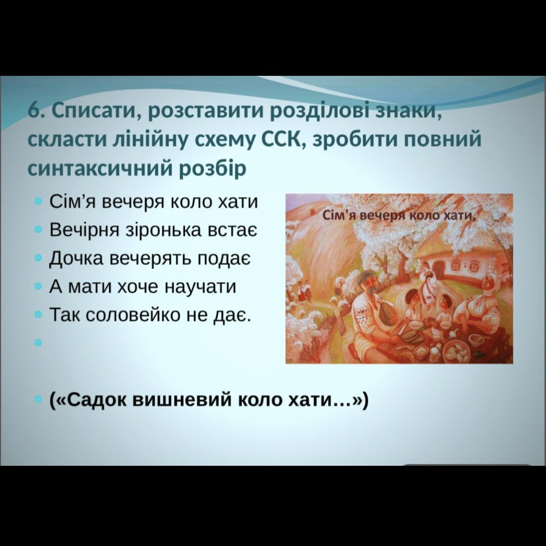 (Речення складне, з різними видами зв’язку (сполучниковий сурядний + бесполучниковий), розповідне, неокличне: 1) двоскладне, поширене, неповне, ускладнене однорідними підметами; 2) двоскладне, поширене, повне, неускладнене; 3) двоскладне, непоширене, повне, неускладнене; 4) двоскладне, непоширене, повне, неускладнене; 5) двоскладне, непоширене, повне, неускладнене).