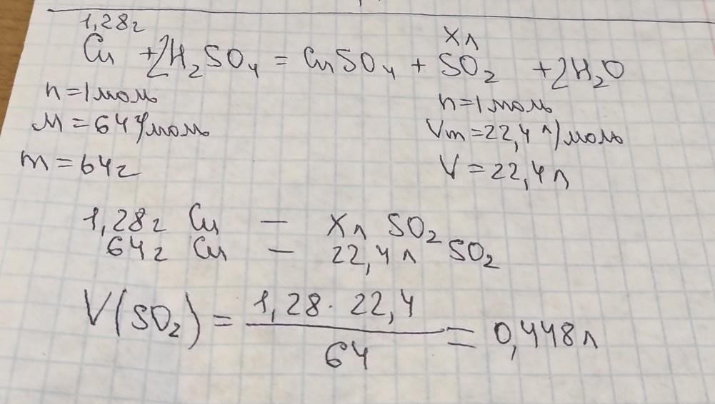 обчисліть об'єм газу, що виділився під час розчинення міді масою 1,28 г у концентрованій сульфатній кислоті