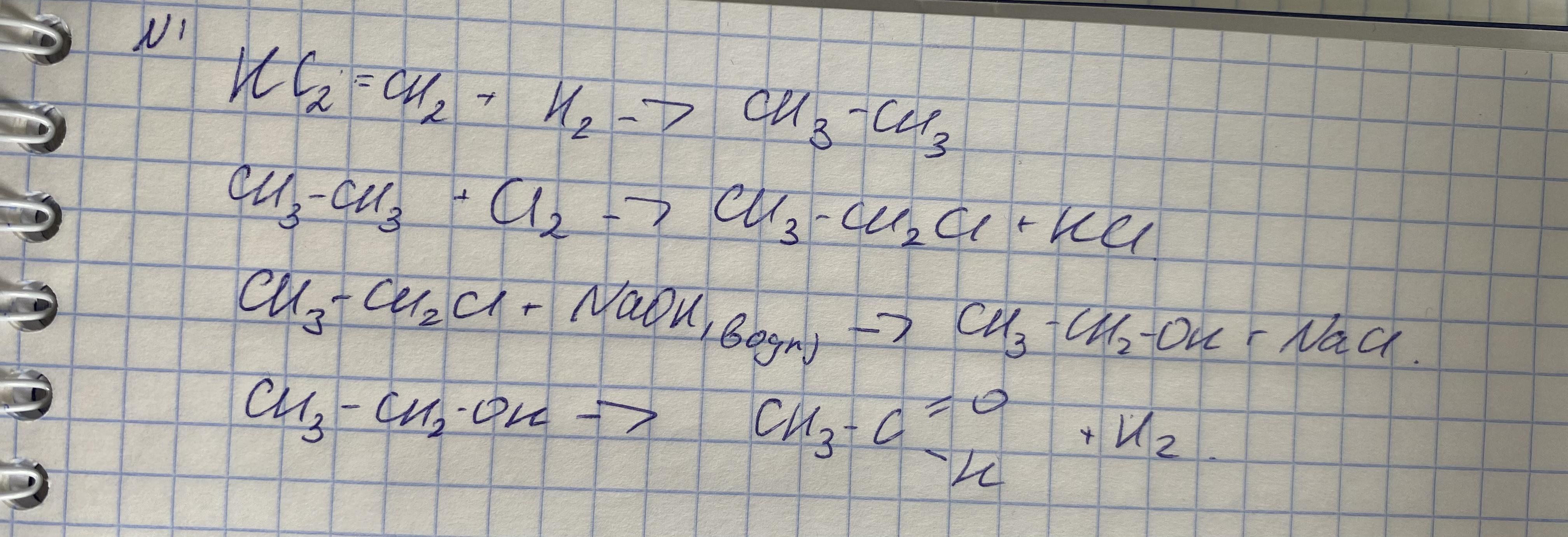 1.Осуществить следующие превращения: C2H4->C2H6->c2H5Cl->C2H5OH->CH3COH
