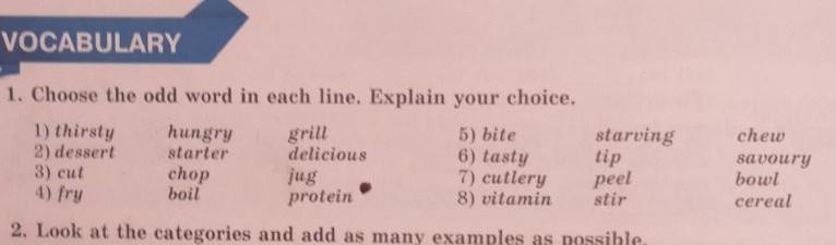 1) grill - Cause the word means an instrument for cooking or action of frying something and the other words mean either feelings or actions of eating.