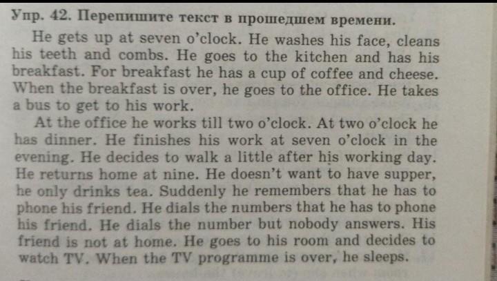 At the office he worked till two o'clock . At two o'clock he had dinner. He finished his work at seven o'clock in the evening. He decided to walk a little after his working day. He returned hime at nine. He didn' want to have supper, he only drank tea. He dialed the number but nobody answer. His friend did not at home. He went to his room and decided to watched TV. When the TV programme did over, he sleep.