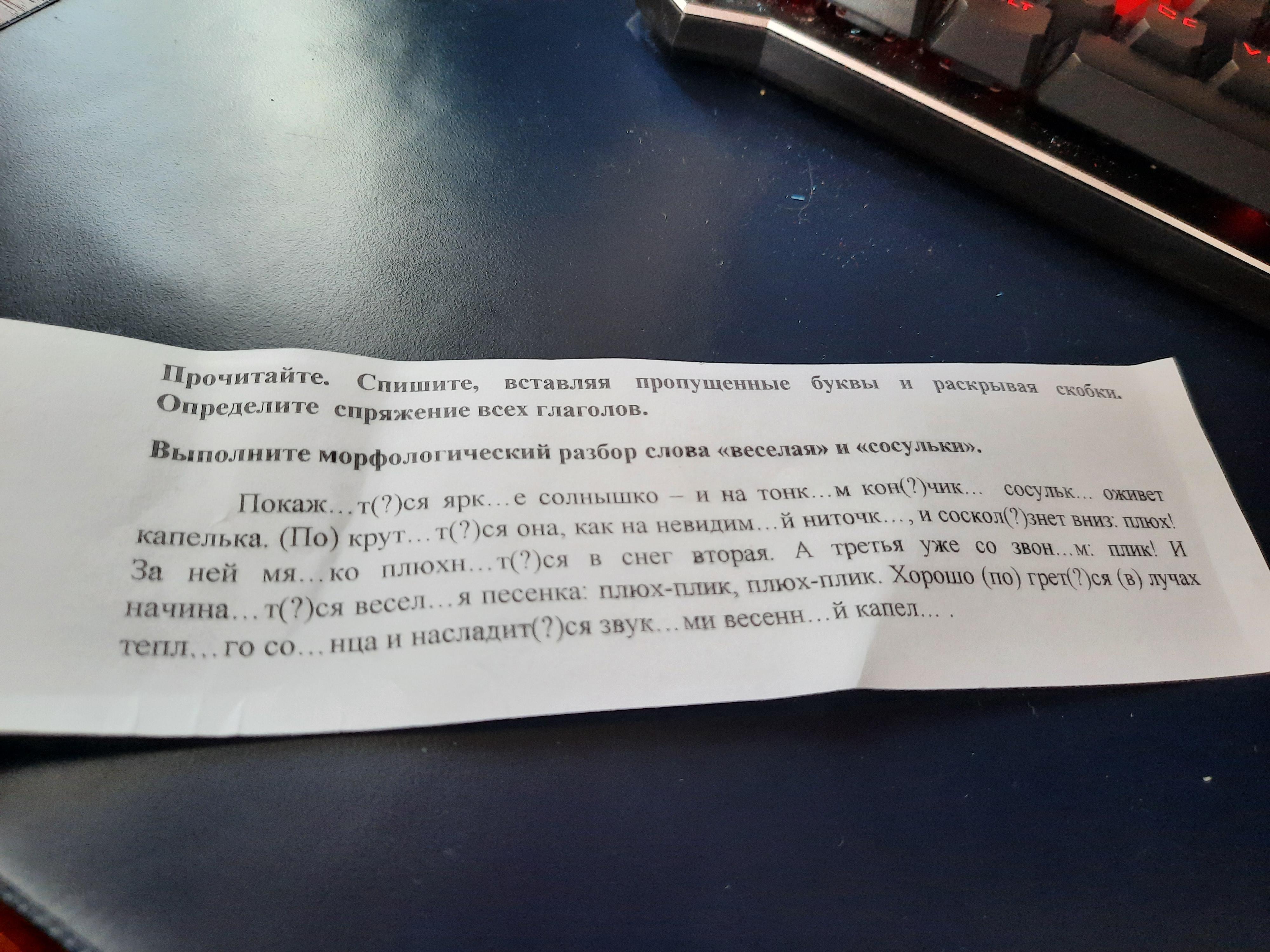 Ответ:покажится (1 спр) яркое солнышко - и на тонком кончике сосулька оживет (2 спр) капелька. Покрутится (2 спр) она, как на невидимой ниточке, и соскользнёт (1 спр) вниз:плюх! За ней мягко плюхнится (1 спр) в снег вторая. А третья уже со звоном плик! И начинается (1 спр) веселая песенка: плюх-плик, плюх-плик. Хорошо по греется (1 спр) в лучах теплого солнца и насладится (1 спр) звуками весенней капели