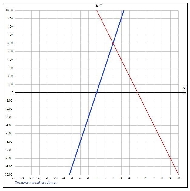 синий у=3х красный у=10-2х графики линейные поэтому строятся по двум точкам.