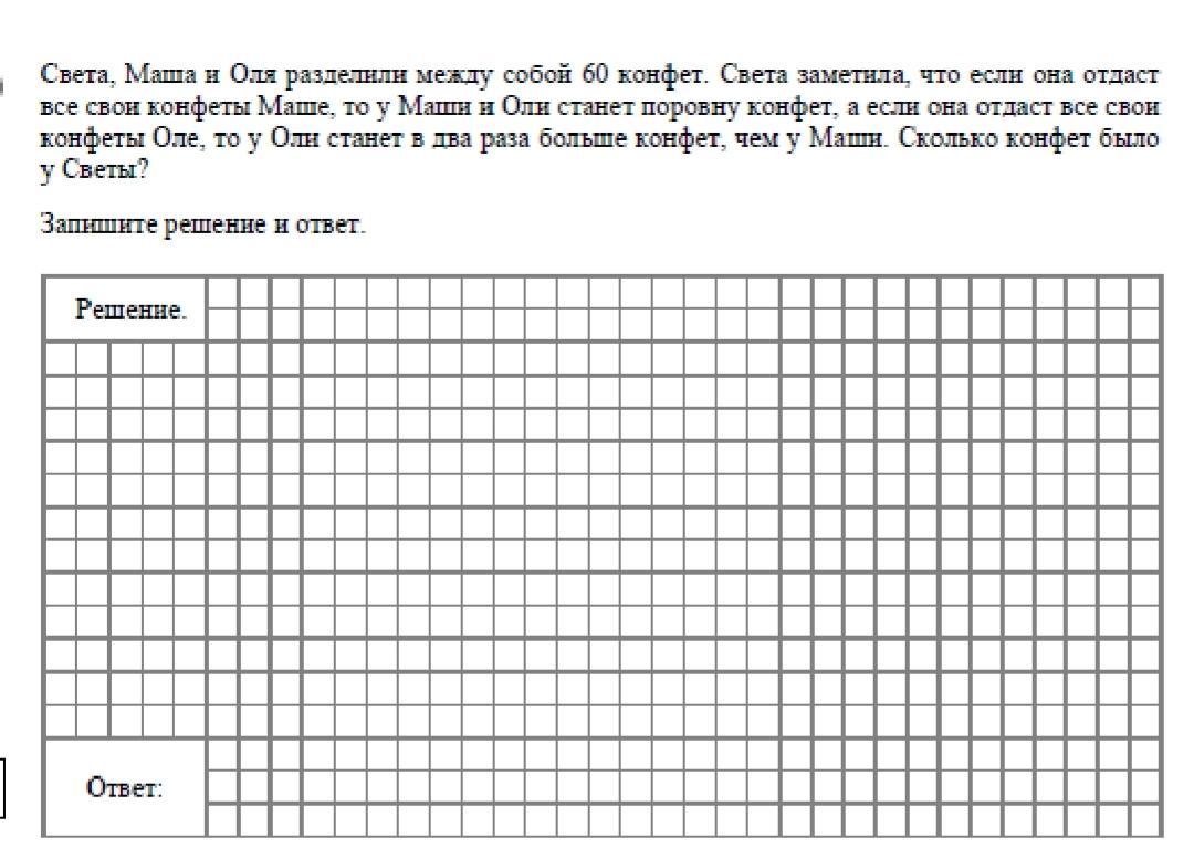 1) Если Света отдаст все свои конфеты Маше, то у Маши и Оли станет поровну конфет, тогда можно найти сколько конфет у Оли:
