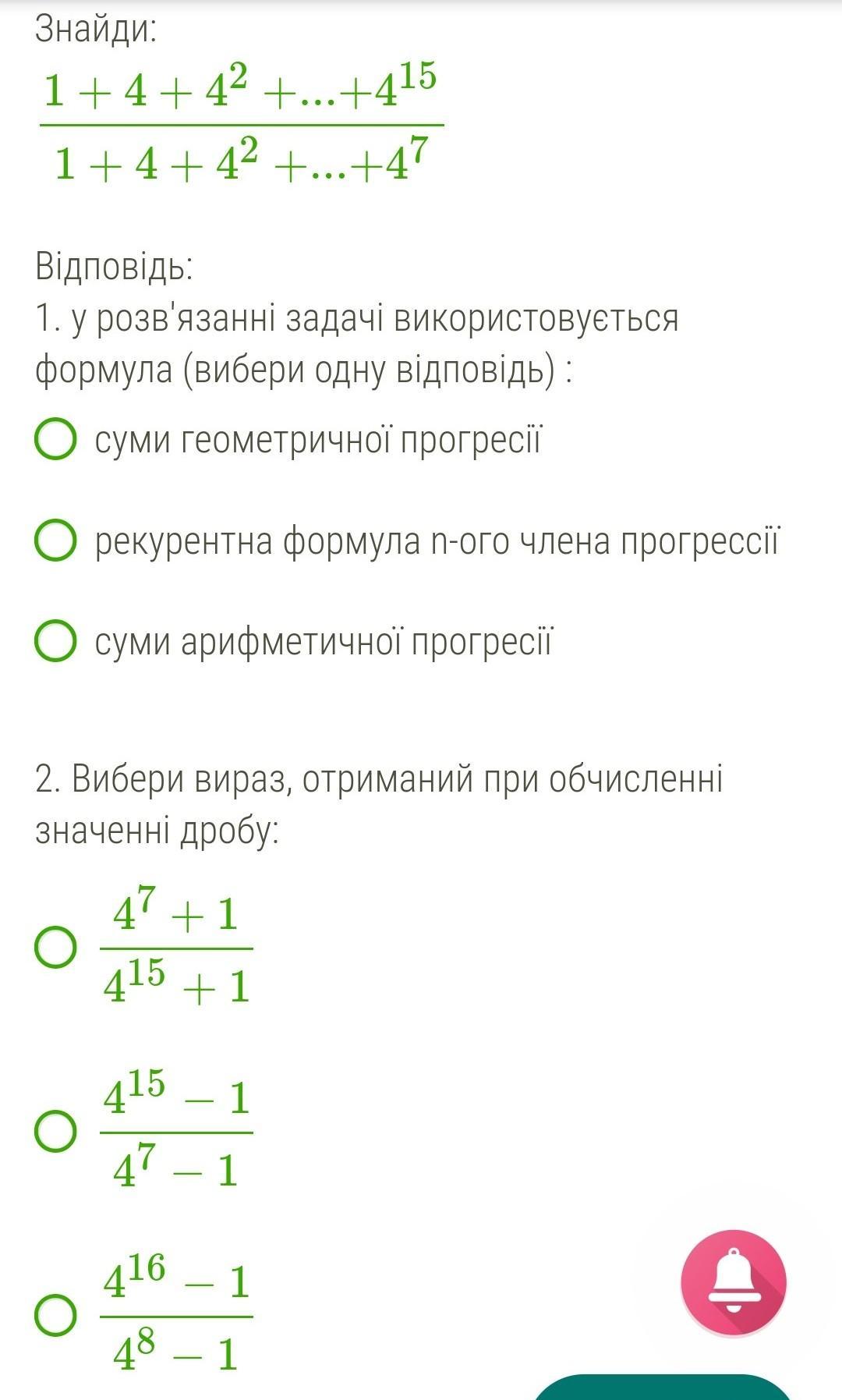 Сумма геометрической прогрессии. Правильный ответ 3-ий, последний. Если выразить числитель через разность квадратов, то получится 4^8+1