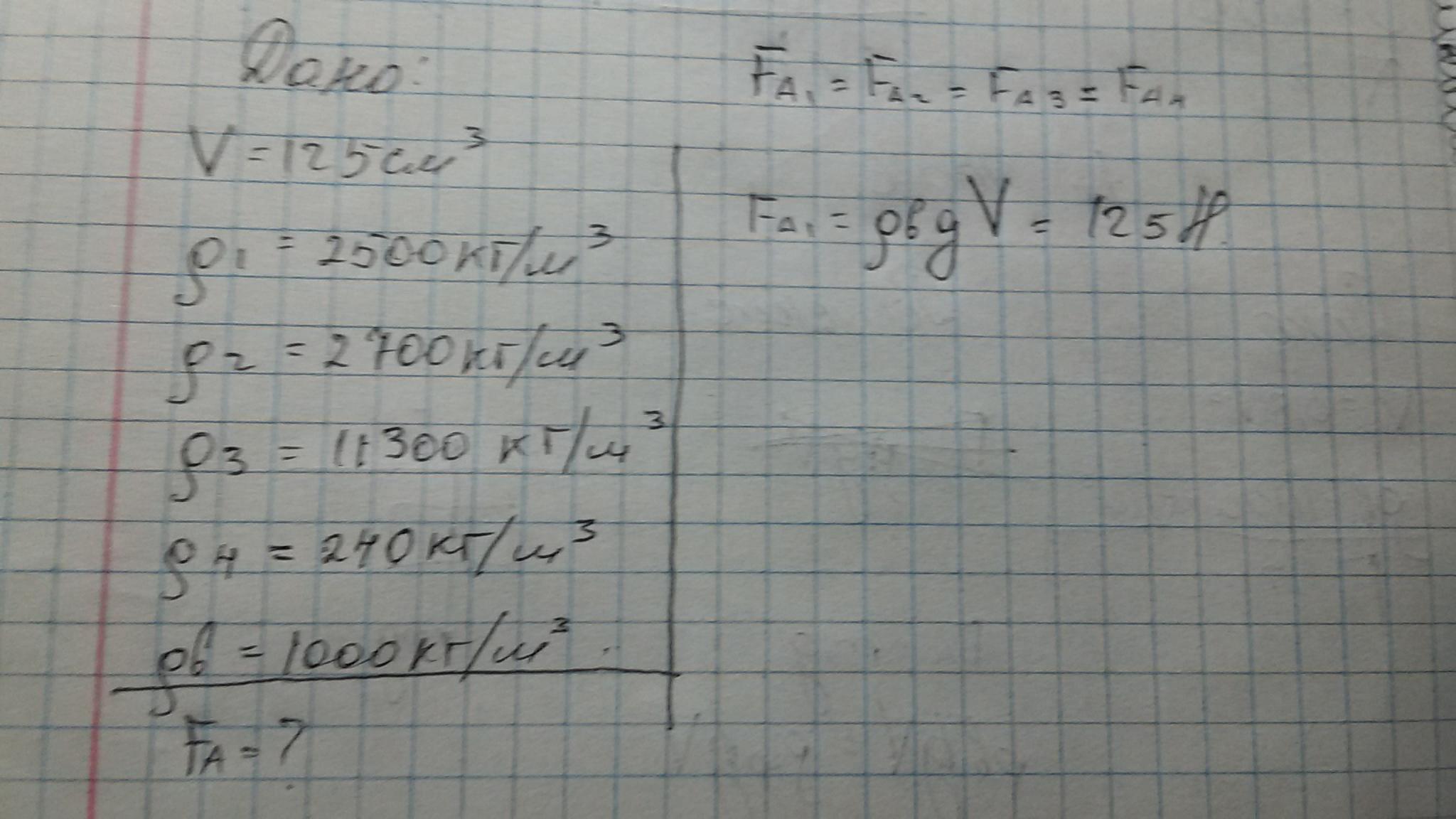 Чему равна архимедова сила действующая на тело объемом 125 см3 из стекла, пробки, алюминия, свинца в воде? Плотности этих тел соответственно равны 2500 кг/м³, 2700 кг/м ³, 11 300 кг/м³, 240 кг/м³. Плотность воды 1000 кг/м³.