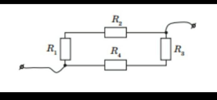 Чотири опори R1 = 2 Ом, R2 = 3 Ом, R3 = 4 Ом, R4 = 5 Ом з'єднанні за схемою. Визначте загальний опір кола