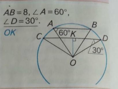 Объяснение: ∠А=60°, ∠В тоже=60° В треугольнике сумма углов равна 180° Найдем ∠АОВ=180-60-60=60°. Треугольник равносторонний, все стороны равны. АВ=АО=ОВ. Стороны равны радиусу окружности. СО и ОД стороны тоже равны радиусу окружности и равны 8. При проведении ОК образуются два прямоугольных треугольника СКО и КОD. ОК катет лежащий против угла 30°. Значит он равен половине гипотенузы. ОК=ОD/2=8/2=4