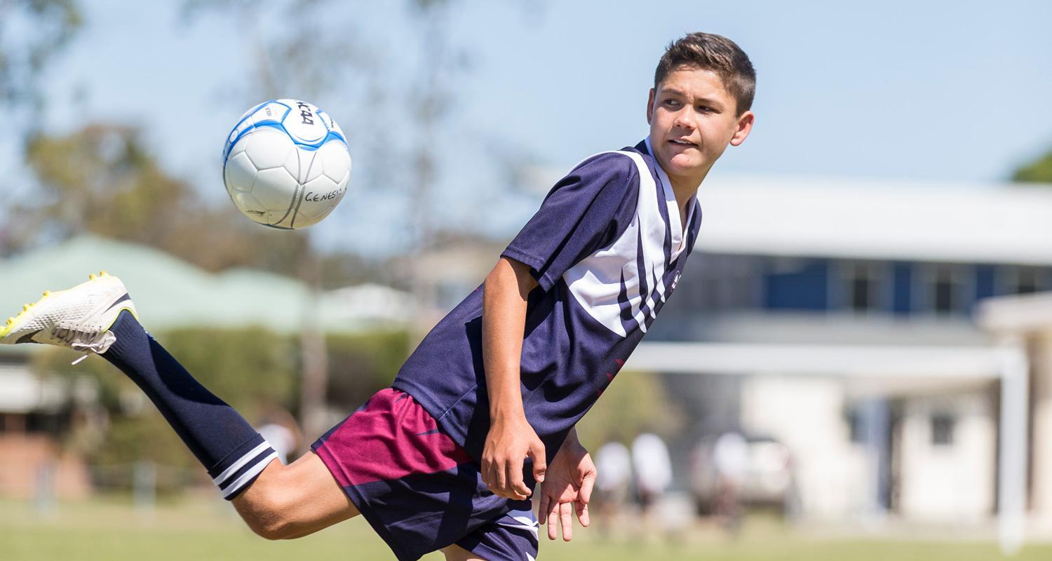 A boy is playing football at the stadium. He is wearing a dark blue and white tshirt, burgundy (or just red) shorts, dark blue knee high socks and white trainers. At the back are seen some buildings.