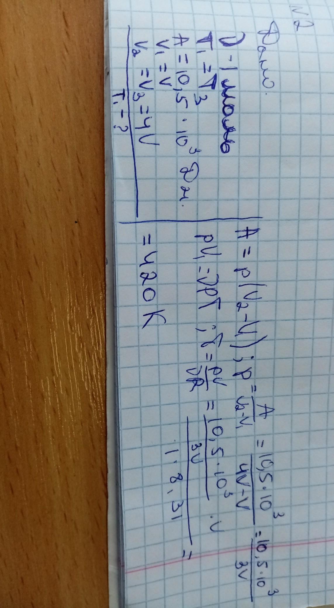 На рисунку наведено графік процесу, що відбувається з 1 моль ідеального газу. Температури газу в станах 1 і 3 збігаються. Знайдіть цю температуру, якщо в результаті процесу газ виконав роботу 10,5 кДж.