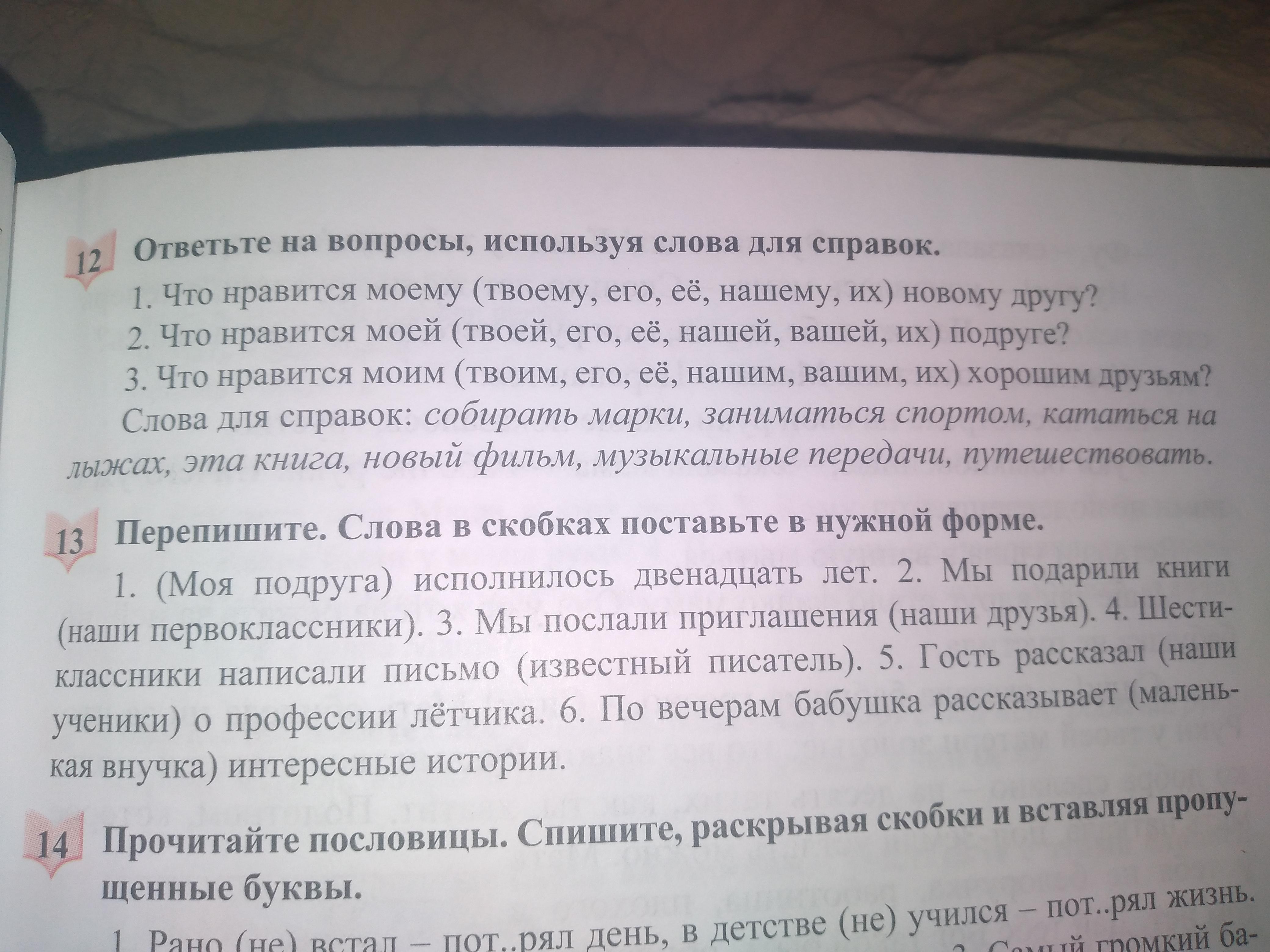 1) Моей подруге исполнилось дведэнадцать лет. 2) Мы подарили книги нашим одноклассникам. 3) Мы послали приглашение нашим друзьям. 4)Шестиклассники написали письмо известному писателю. 5)Гость рассказал нашим ученикам о профессии лётчика. 6)По вечерам бабушка рассказывает маленькой внучка интересные истории.