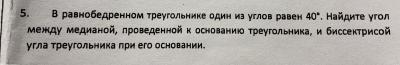 Вот что я нарисовал. Тут не могут быть разные медианы и биссектрисы. Можешь написать, что угол между ними равен 0, так как медиана и биссектриса это одно и тоже в равнобедренном треугольнике.