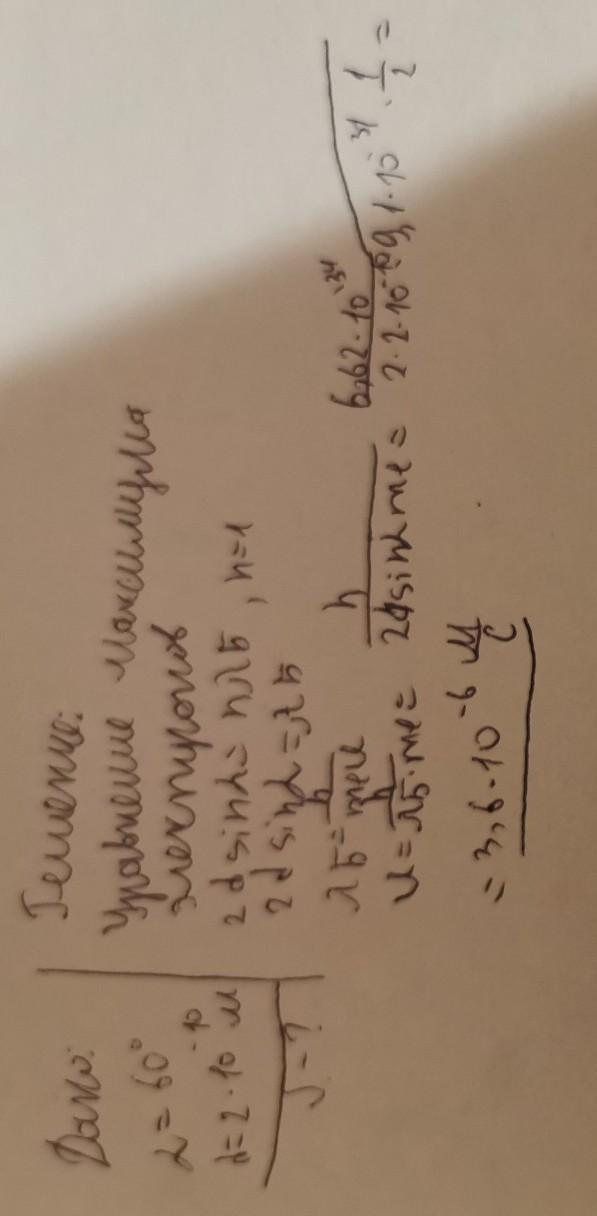 На грань некоторого кристалла под углом 60° к ее поверхности падает параллельный пучок электронов, движущихся с одинаковой скоростью. Определить скорость v электронов, если они испытывают интерференционное отражение первого порядка. Расстояние d между атомными плоскостями кристаллов равно 0,2 нм.