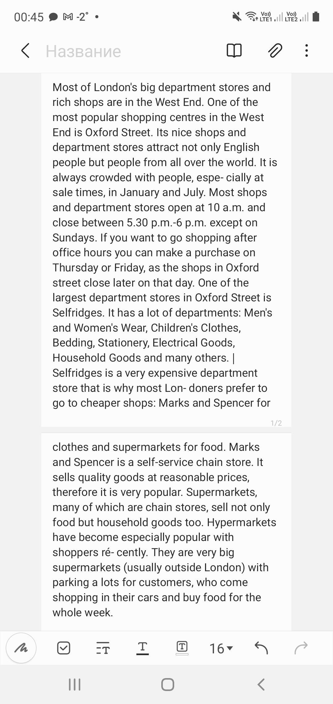 Большинство крупных универмагов и богатых магазинов Лондона находятся в Вест-Энде. Один из самых популярных торговых центров Вест-Энда - Оксфорд-стрит. Его красивые магазины и универмаги привлекают не только англичан, но и людей со всего мира. Он всегда переполнен людьми, особенно во время распродаж, в январе и июле. Большинство магазинов и универмагов открываются в 10:00 и закрываются с 17:30 до 18:00. кроме воскресенья. Если вы хотите пойти за покупками в нерабочее время, вы можете сделать покупку в четверг или пятницу, так как магазины на Оксфорд-стрит в этот же день закрываются позже. Один из крупнейших универмагов на Оксфорд-стрит - Selfridges. В нем много отделов: мужская и женская одежда, детская одежда, постельные принадлежности, канцелярские товары, электротовары, товары для дома и многие другие. Selfridges - очень дорогой универмаг, поэтому большинство жителей Лондона предпочитают ходить в более дешевые магазины: Marks and Spencer за одеждой и супермаркетами за продуктами. Marks and Spencer - сеть магазинов самообслуживания. В нем продаются качественные товары по доступным ценам, поэтому он очень популярен. В супермаркетах, многие из которых являются сетевыми, продаются не только продукты питания, но и товары для дома. Гипермаркеты стали особенно популярны у покупателей в последнее время. Это очень большие супермаркеты (обычно за пределами Лондона) с парковочными местами для клиентов, которые приезжают за покупками на своих машинах и покупают еду на всю неделю.