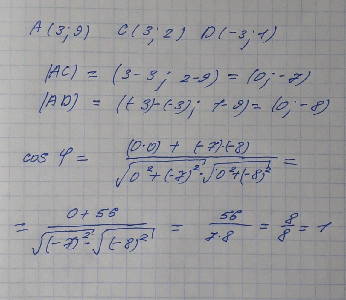Даны точки А(3; 9), С(3; 2) и D( -3; 1). Найдите косинус угла между векторами АС и АD. Ответ вводить в виде десятичной дроби.