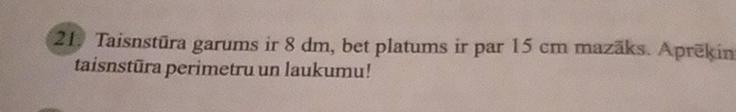 Taisnstūra garums ir 8 dm, bet platums ir par 15 cm mazāks. Aprēķini