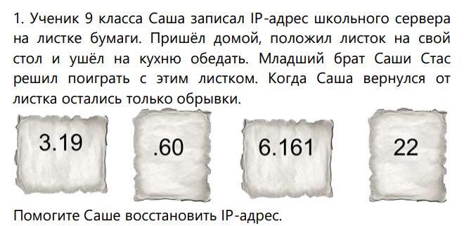 Ученик 9 класса Саша записал IP-адрес школьного сервера на листке бумаги. Пришёл домой, положил листок на свой стол и ушёл на кухню обедать. Младший брат Саши Стас решил поиграть с этим листком. Когда Саша вернулся, от листка остались только обрывки. (см.фото).