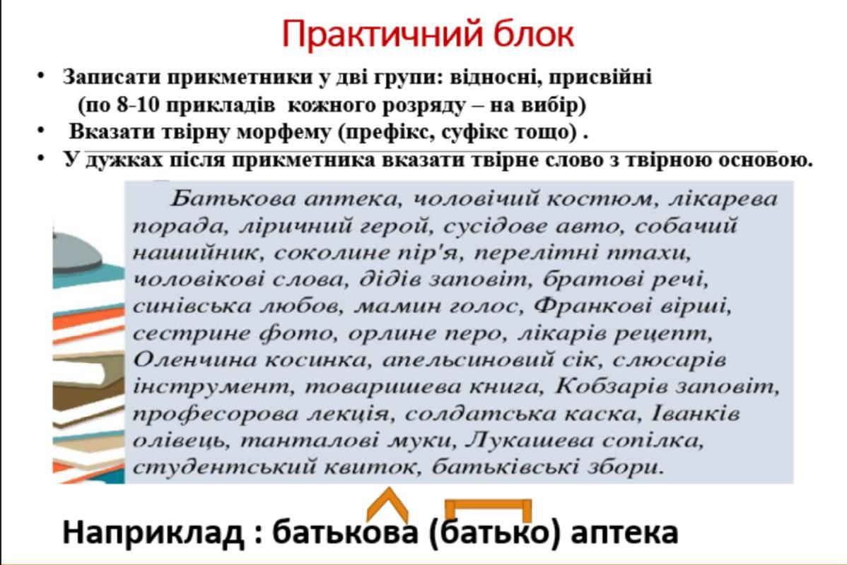 ліричний (лірика) герой апельсиновий (апельсин) сік батьківські (батько) збори солдатська (солдат) каска перелітні (переліт) птахи студентський (студент) квиток собачий (собака) нашийник соколине (сокол) пір"я орлине (орел) перо - відносні