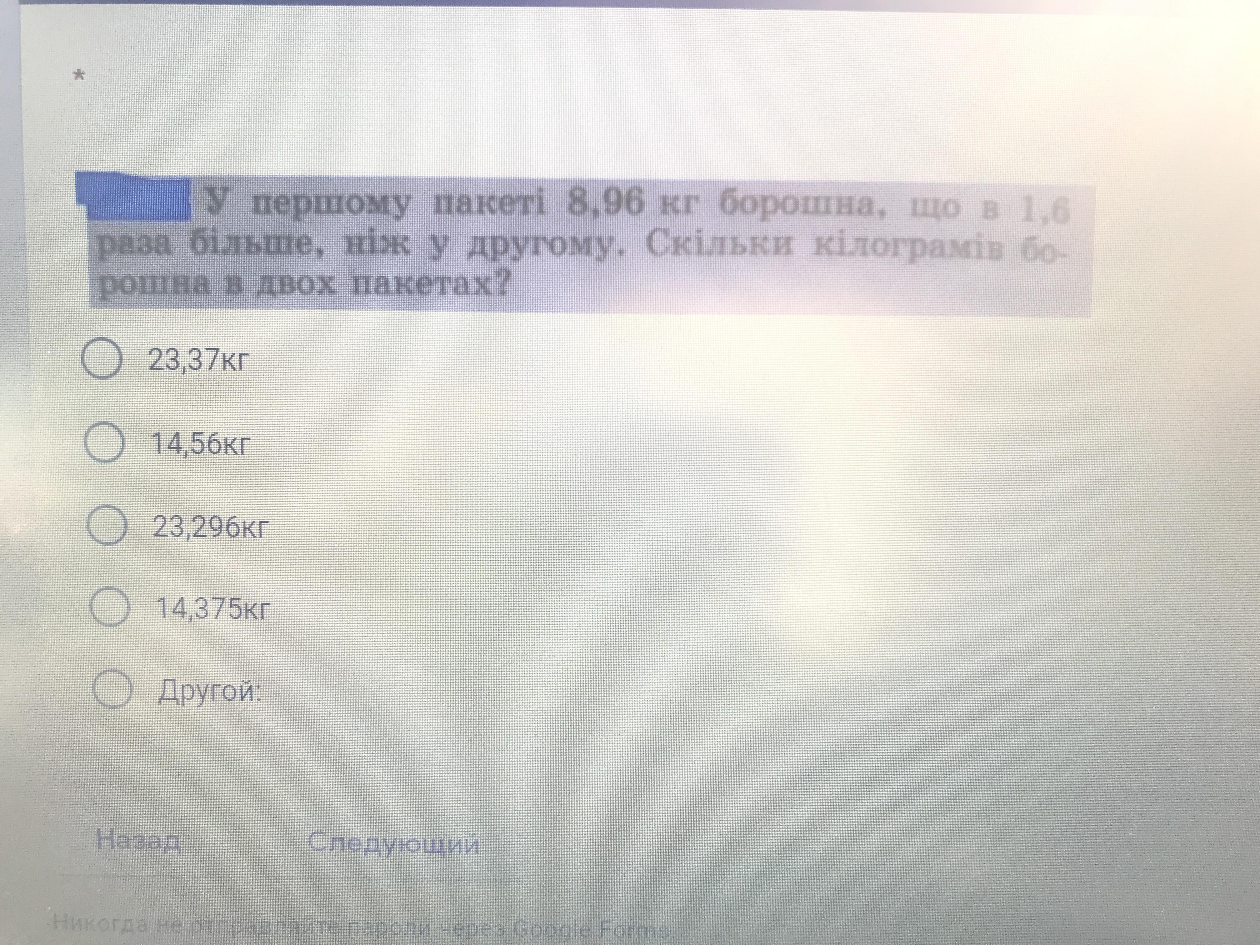У першому пакеті 8,96кг борошна, що в 1,6 разу більше, ніж у другому. Скільки кілограмів борошна в двох пакетах?